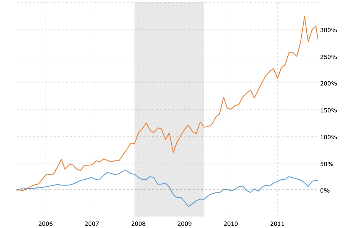 During the 2008 financial crisis, the stock market crashed dramatically - the S&P 500 fell by over 37%! Meanwhile gold prices ended the year higher, as investors sought a safe haven against economic uncertainty.